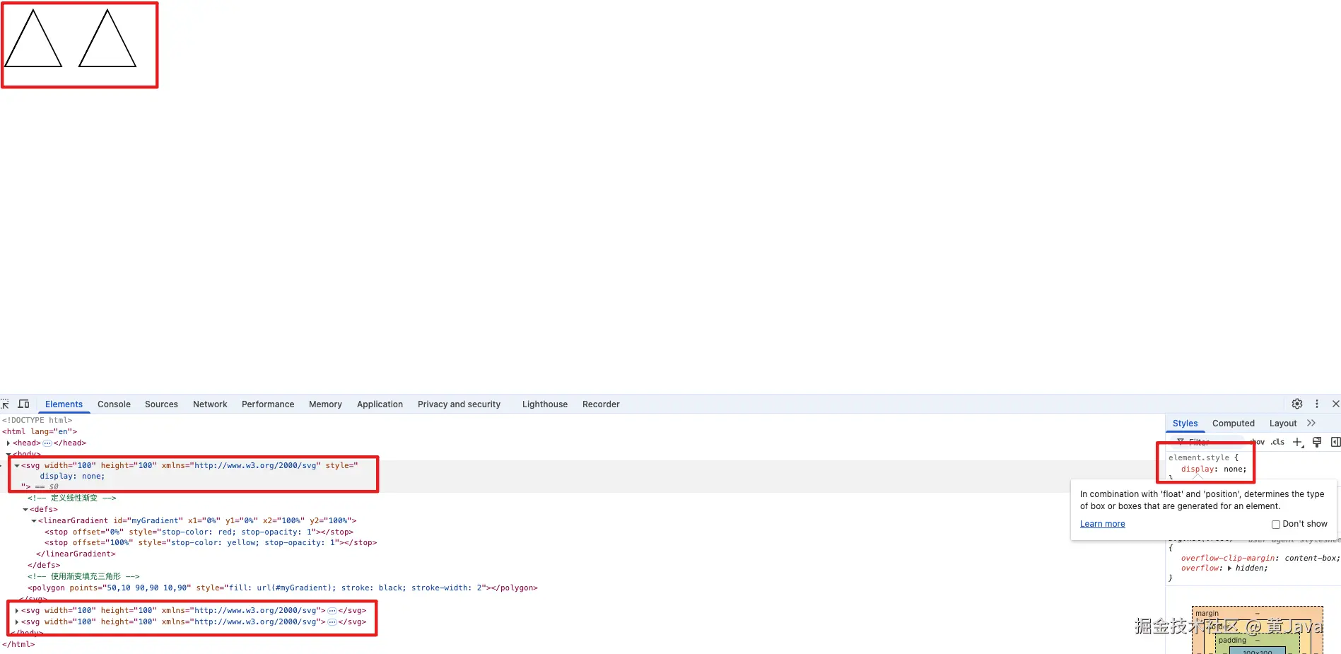 大家可以看到,第一个元素因为CSS设置原因,从页面中隐藏,这个是符合我们的认知的,但是为什么第二个和第三个SVG的渐变效果会消失呢?然后还留下了一个黑色的边框。