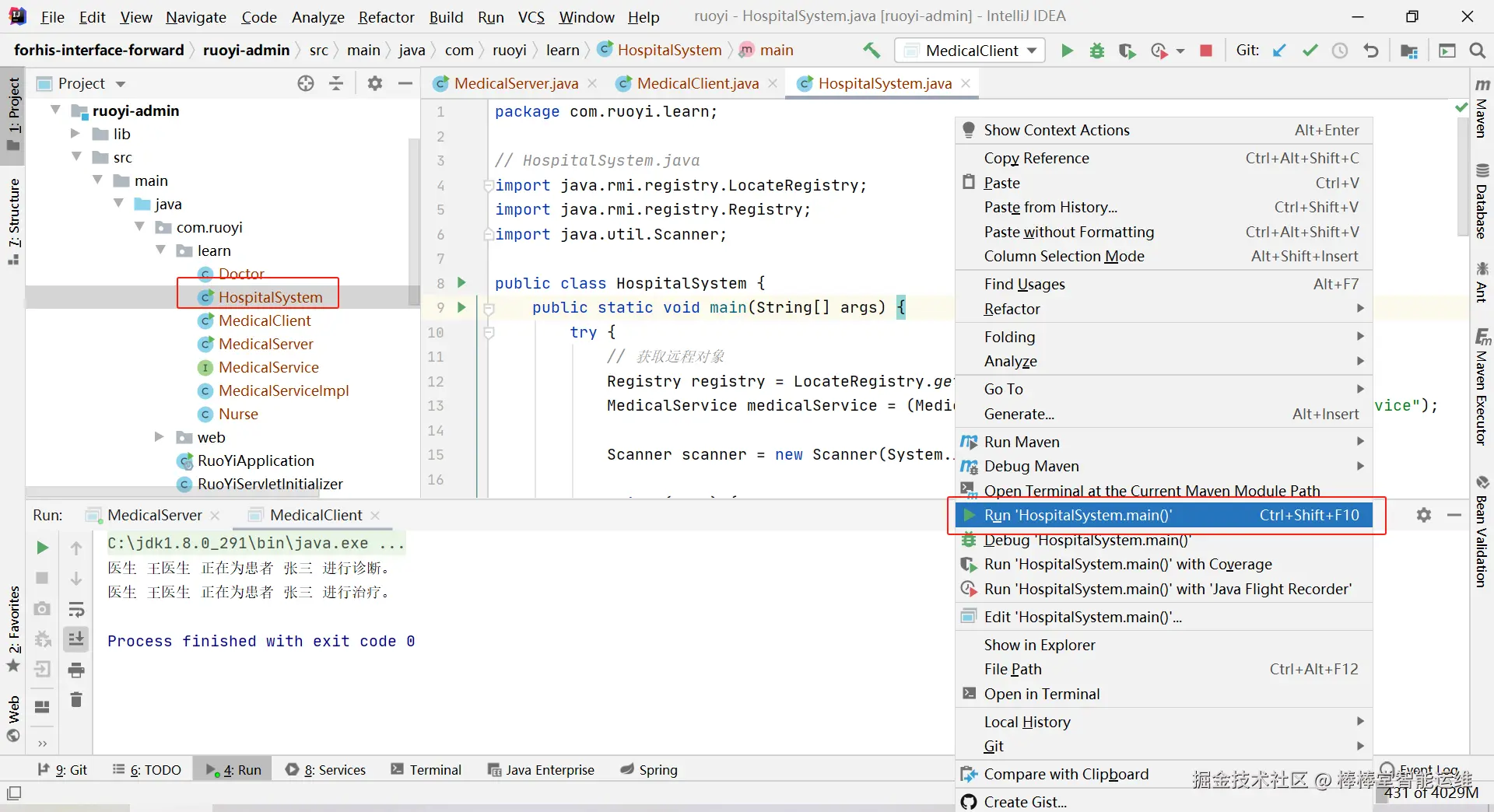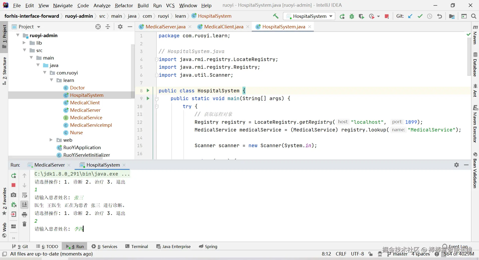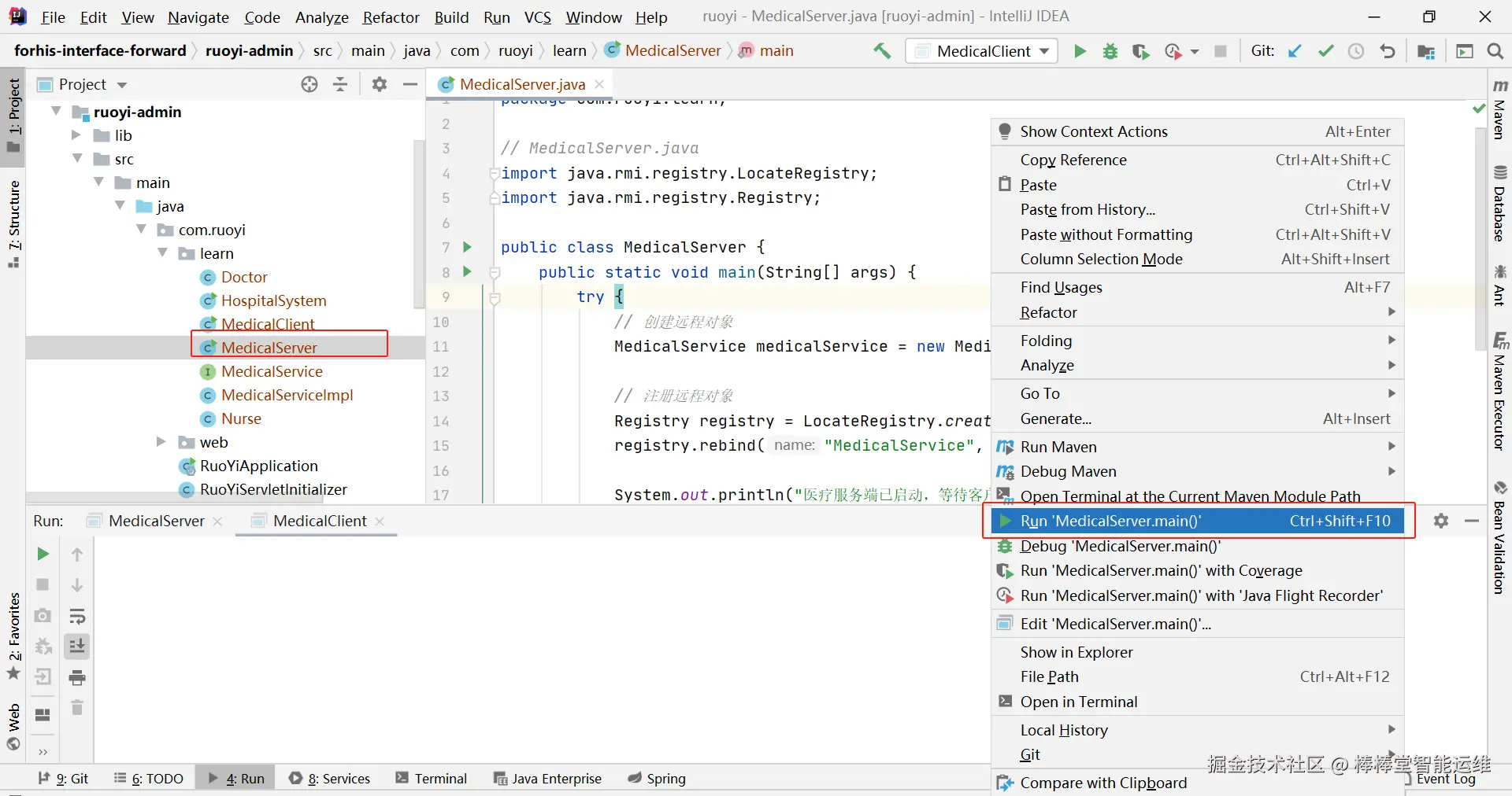 Doctor类和Nurse类,分别实现MedicalService接口。 - 服务端实现:实现服务端程序,提供远程医疗服务。