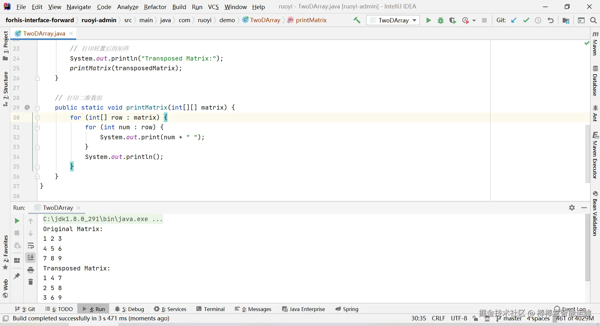 - 遍历二维数组并打印矩阵。
