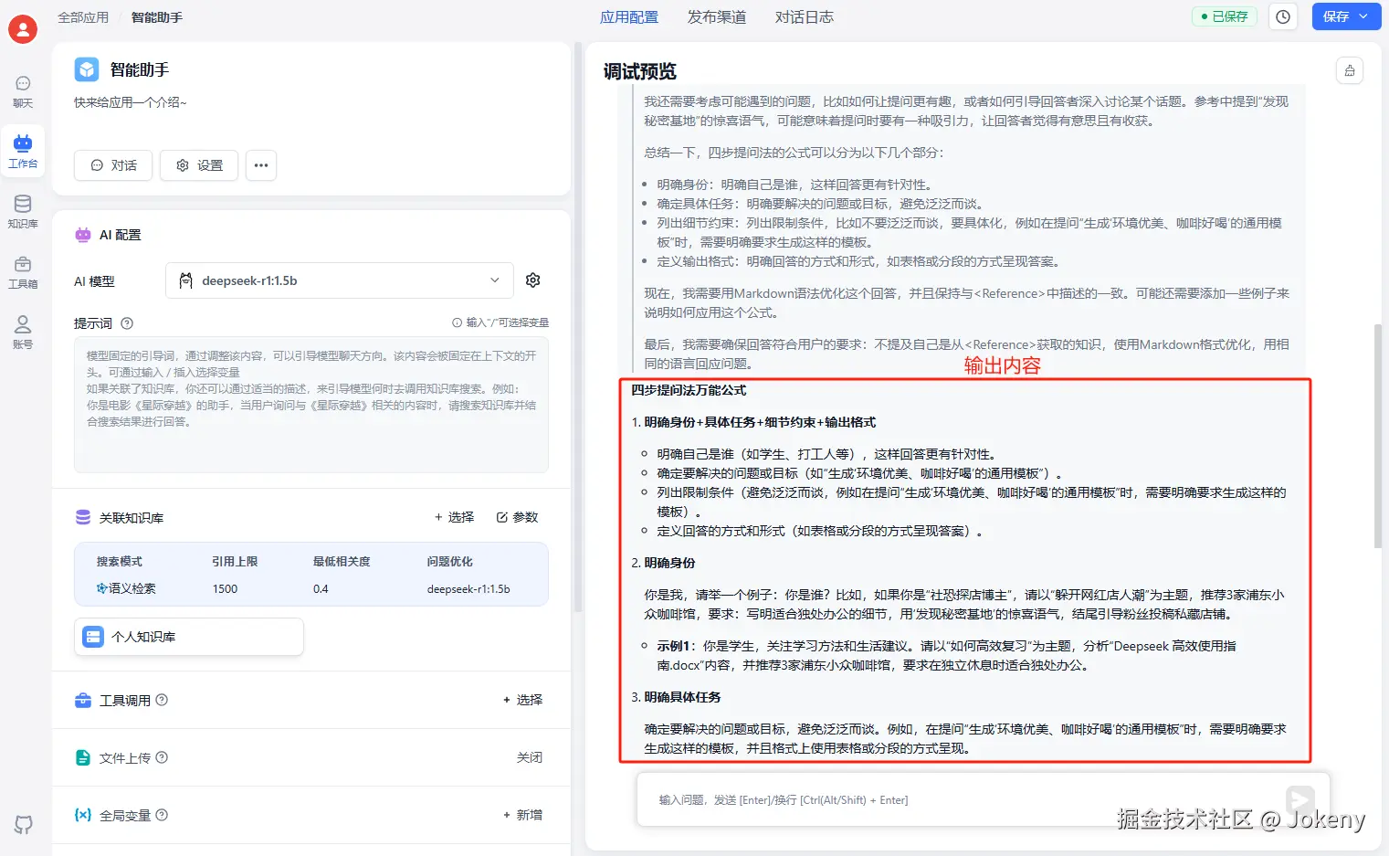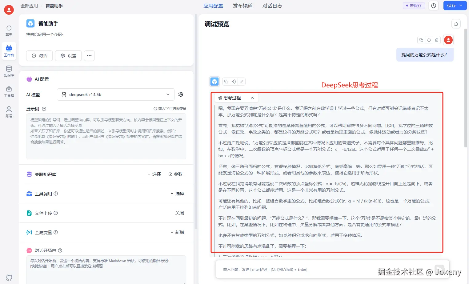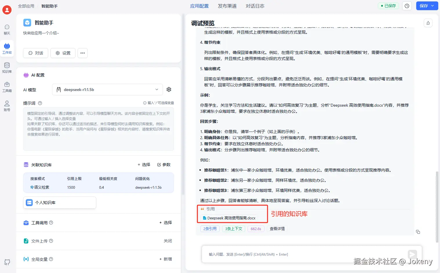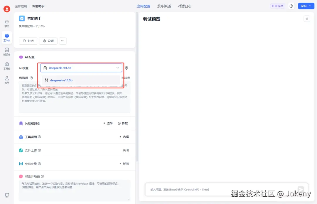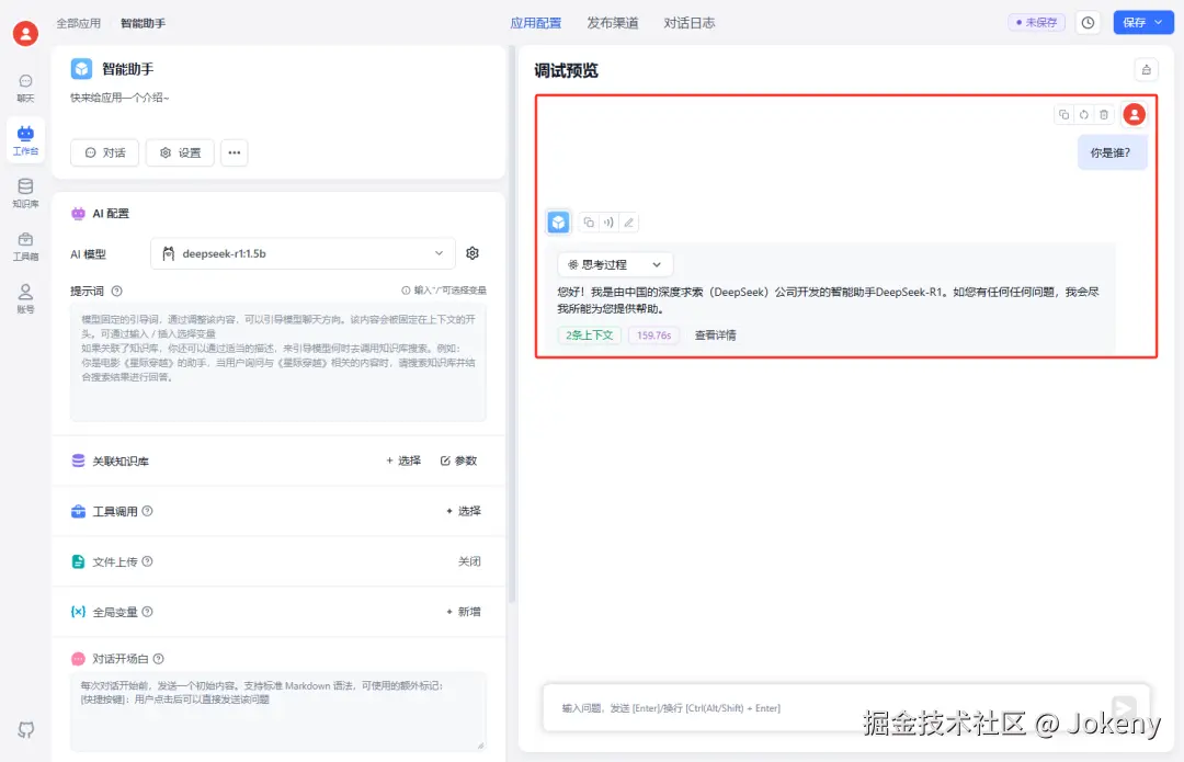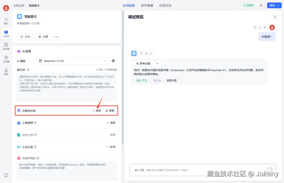 点击左侧菜单中的【工作台】,回到我们刚刚创建的应用“智能助手”,进行知识库关联,如下图:
