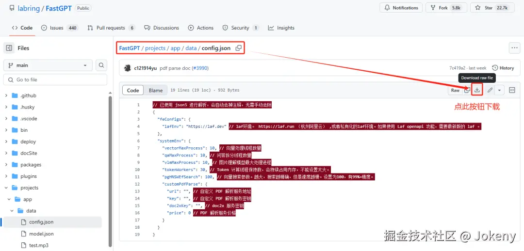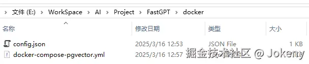 本地创建一个 FastGPT 目录,然后下载 config.json 和 docker-compose.yml 文件,如下图: