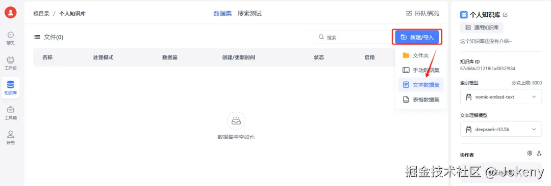 右上方点击【新建/导入】,选择“文本数据集”