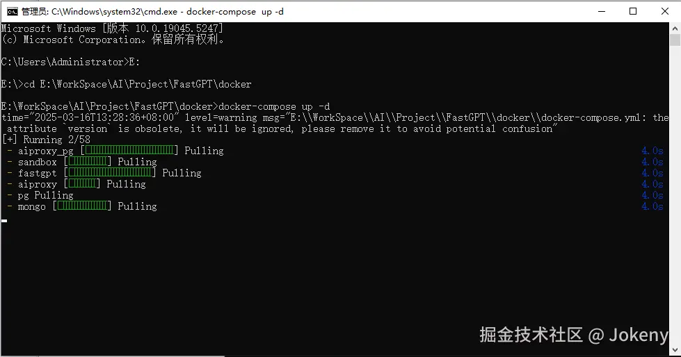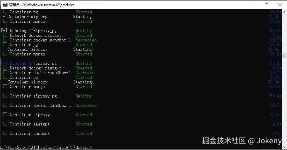 打开命令提示符,进入 FastGPT 目录下的 docker 目录,再输入 docker-compose up -d 指令,回车