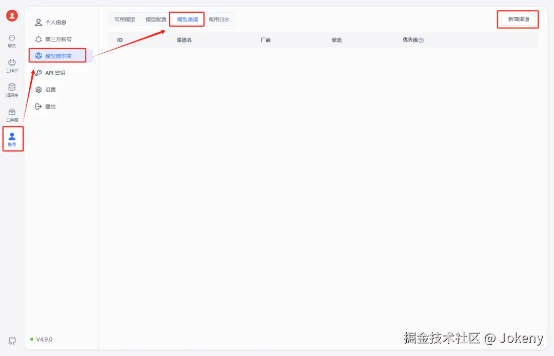 tab页切换到【模型渠道】,点击【新增渠道】