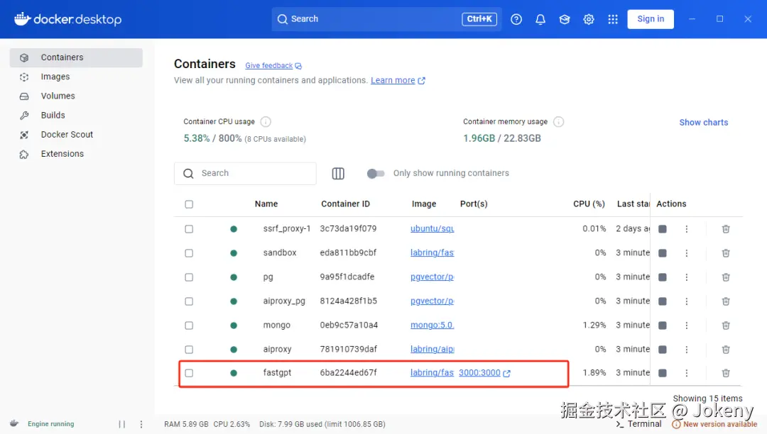 容器启动成功后会在 Docker 中看到 fastgpt,如下图: