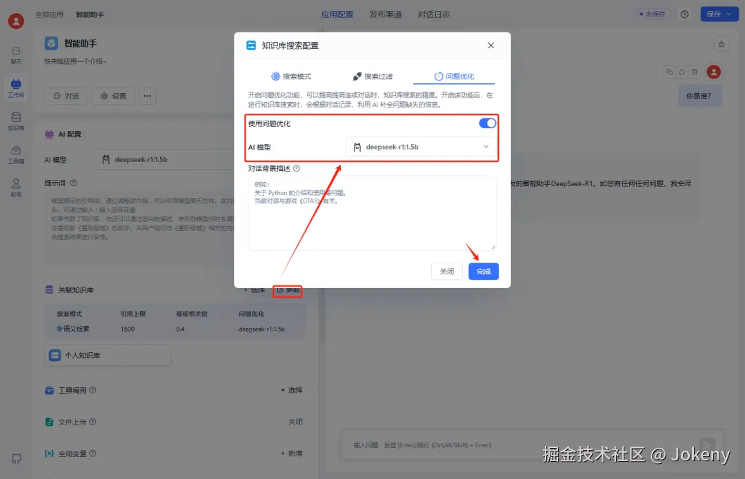 完成关联后,点击【参数】进行配置,可以设置“搜索模式”、“搜索过滤”和“问题优化”,这里设置“问题优化”,AI模型还是选择deepseek r1,如下图: