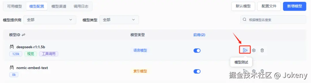 tab页切换到【模型配置】,点击【模型测试】按钮校验已添加的模型是否可用,如下图: