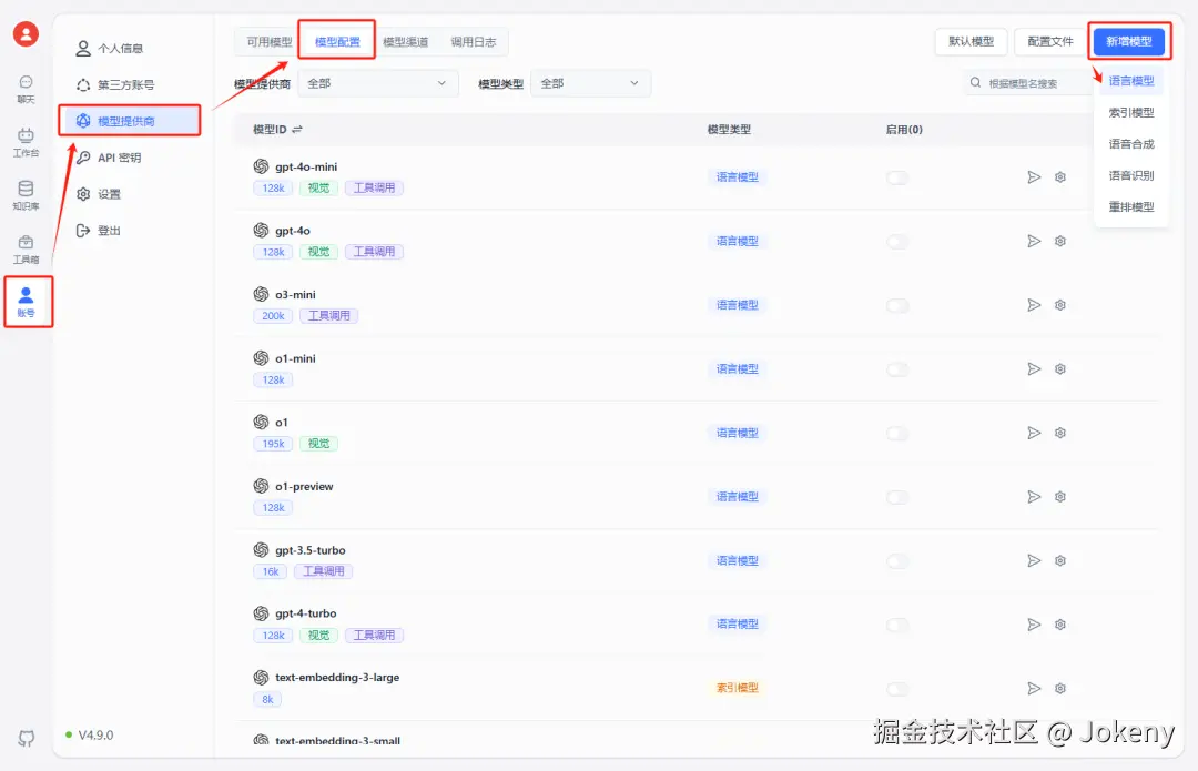 点击左侧菜单【账号】,选择【模型提供商】,点击【模型配置】,点击右上角【新增模型】按钮并选择“语言模型”,如下图:
