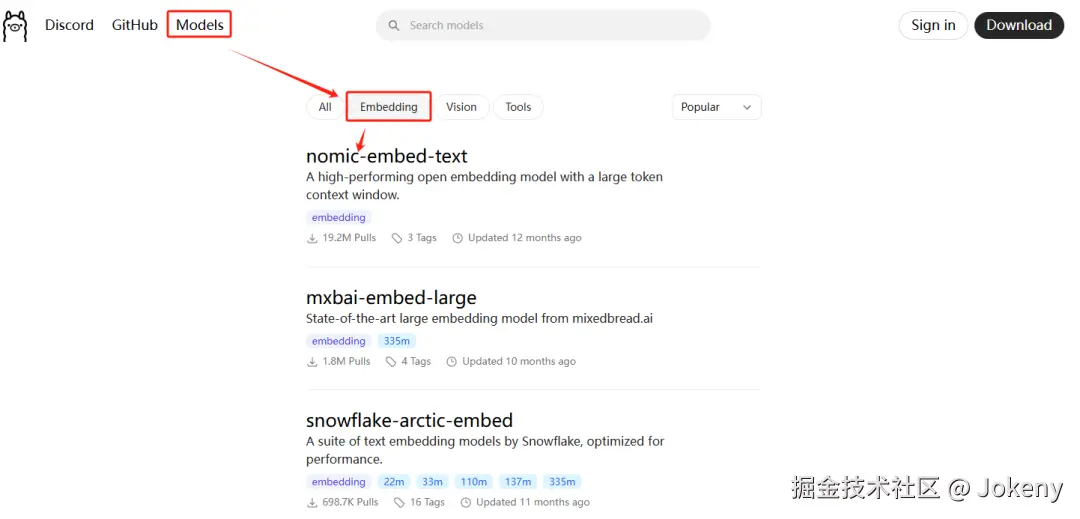 进入官网后选择【Models】,再选择下方的【Embedding】,点击“nomic-embed-text”,如下图: