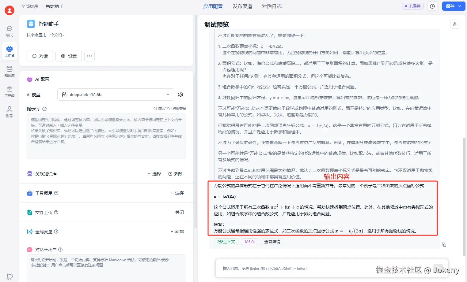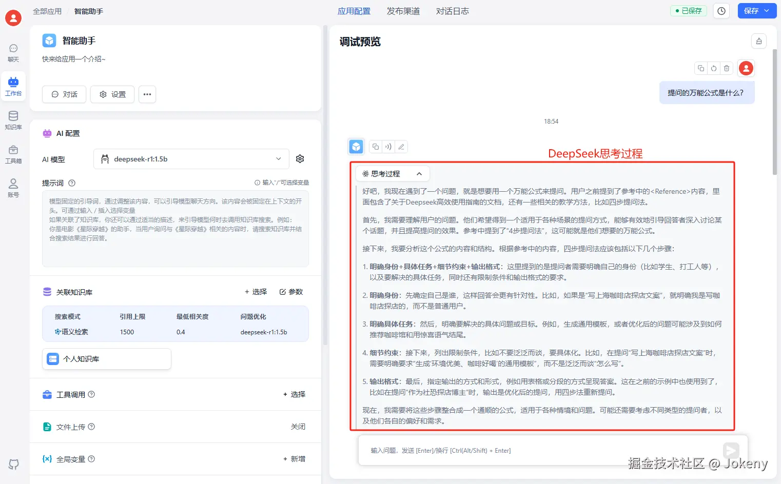 可以看到给出了思考过程,并且显示了引用的知识库文档,处理时间及详情信息。下面不关联知识库,输入“提问的万能公式是什么?”,输出的内容如下: