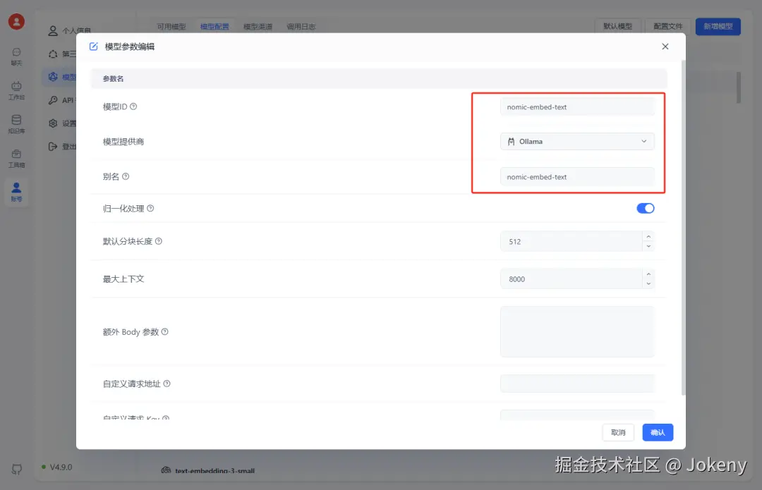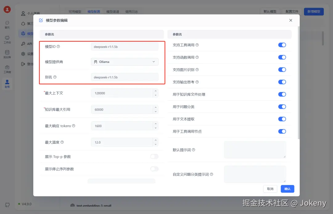 输入“模型ID”、“模型提供商”、“模型”,且“模型ID”需与Ollama中安装的模型名称一致,如下图: