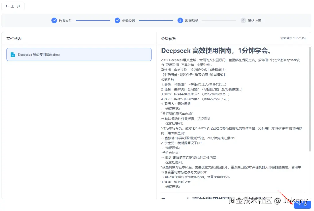 点击左侧的文件,我们可以在右侧预览分块,继续点击【下一步】