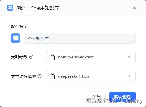 输入“知识库名称”、选择“索引模型”和“文本理解模型”,点击【确认创建】