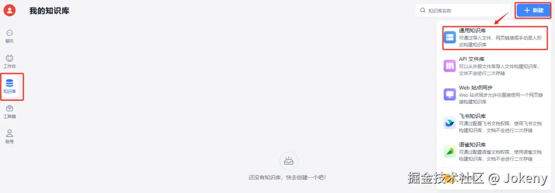 选择左侧菜单栏中的【知识库】,点击右上角【新建】按钮,选择“通用知识库”。