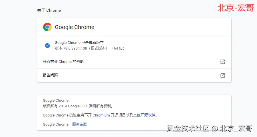 右上角——>帮助——>关于Google Chrome,点击后如下图:查看版本号一致。