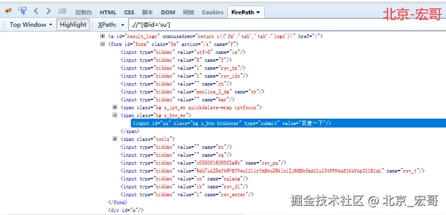以百度首页的“百度一下”按钮为例,我们通过by_css来定位到这个按钮。如图