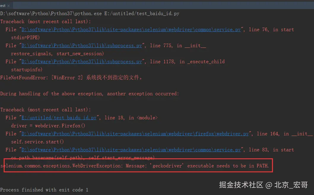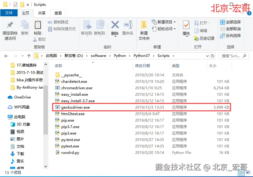 去下载一个driver插件geckodriver.exe, 下载地址:github.com/mozilla/gec…,下载好这个exe文件后,把这个文件放到你的python安装目录下,例如宏哥放的位置如下图: