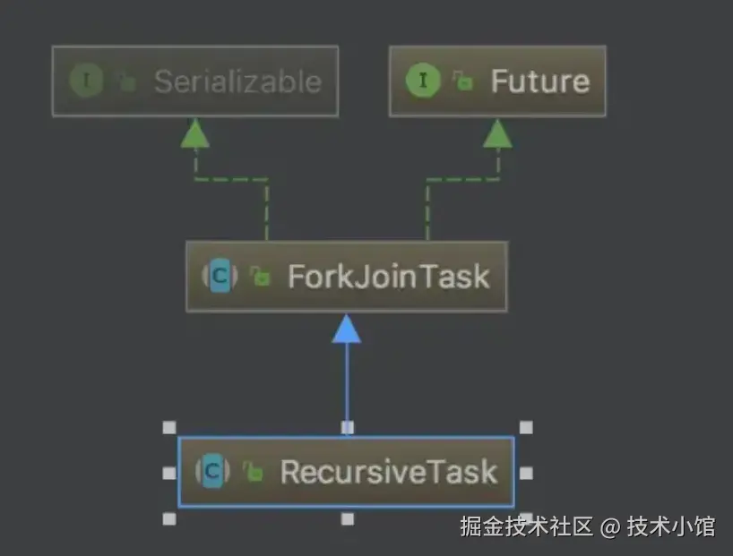 ForkJoinTask有两个常用的子类,它们用于支持不同类型的任务:有返回值的任务使用RecursiveTask,没有返回值的任务使用RecursiveAction。