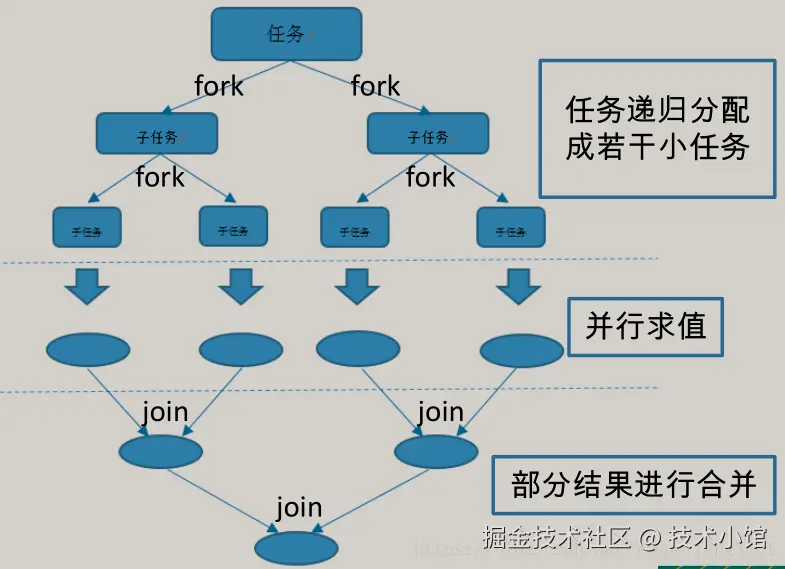 leftTask.fork()和rightTask.fork()异步执行两个子任务。leftTask.join()和rightTask.join()等待子任务的结果并将结果合并。