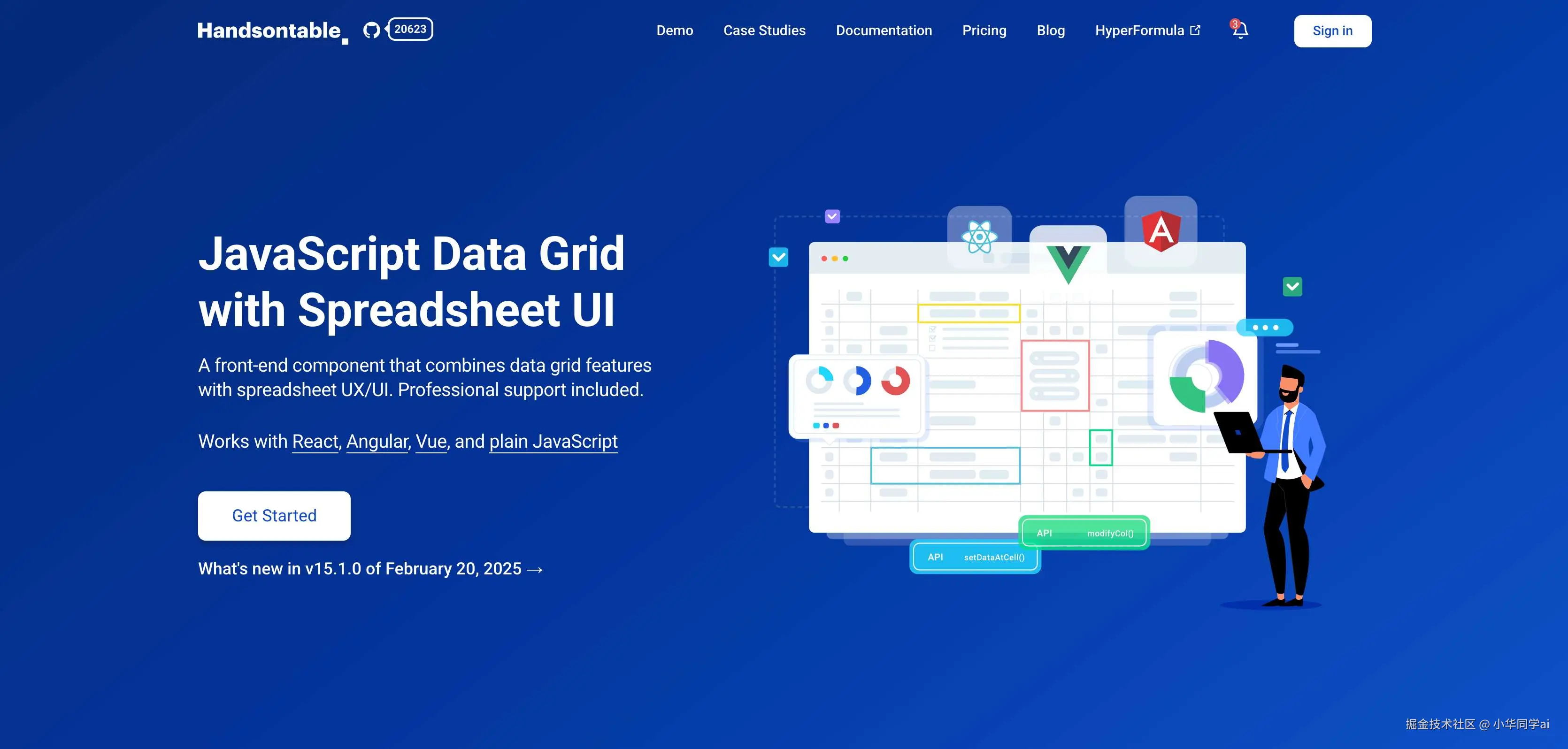 Handsontable 是一款功能强大的 JavaScript 数据表格组件,提供类 Excel 的交互体验。支持实时协作、数据绑定、公式计算等企业级功能,可轻松集成到 React/Vue/Angular 等主流框架。