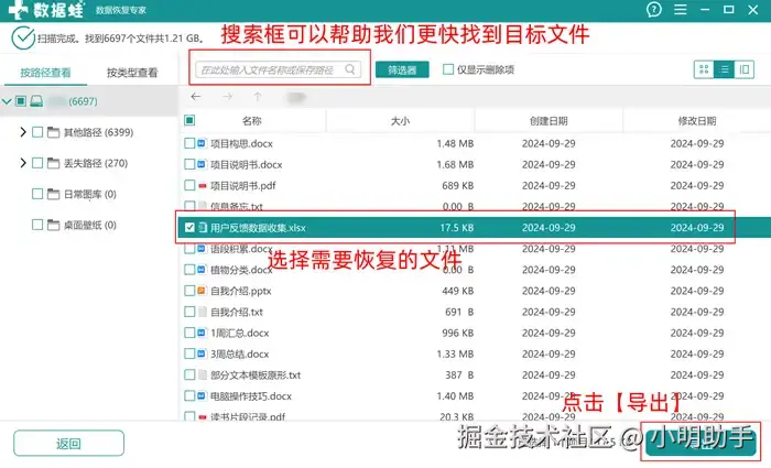 步骤2:在扫描出来的文件中,勾选出自己需要恢复的文件,如果一时间找不到,可以选择借用搜索框,在里面输入目标文件的原文件名进行搜索;选中目标文件后,点击【导出】将文件恢复;