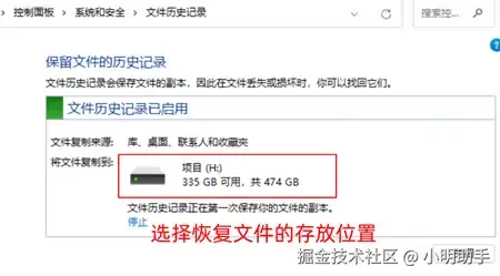 步骤2:在其主页面中找到【文件历史记录】,最后在里面选择【还原个人文件】。选择你需要的已删除文件,然后点击【还原】。