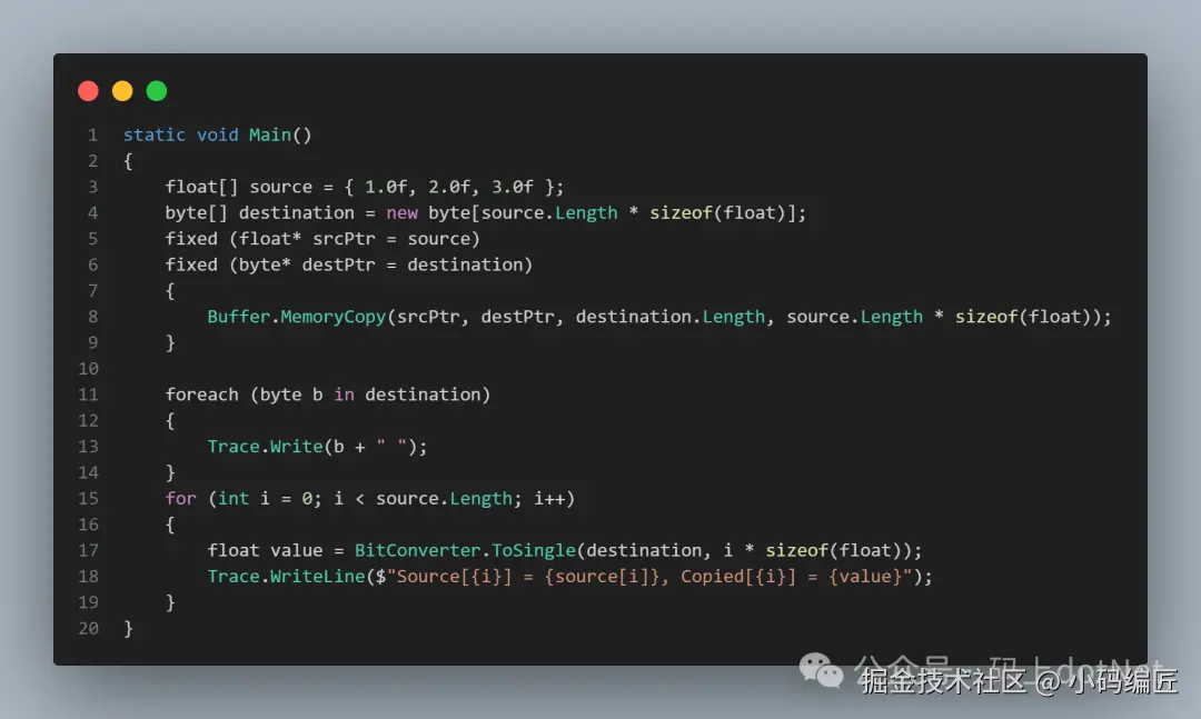 使用 Buffer.MemoryCopy 将 float 数组的二进制数据拷贝到 byte 数组中。