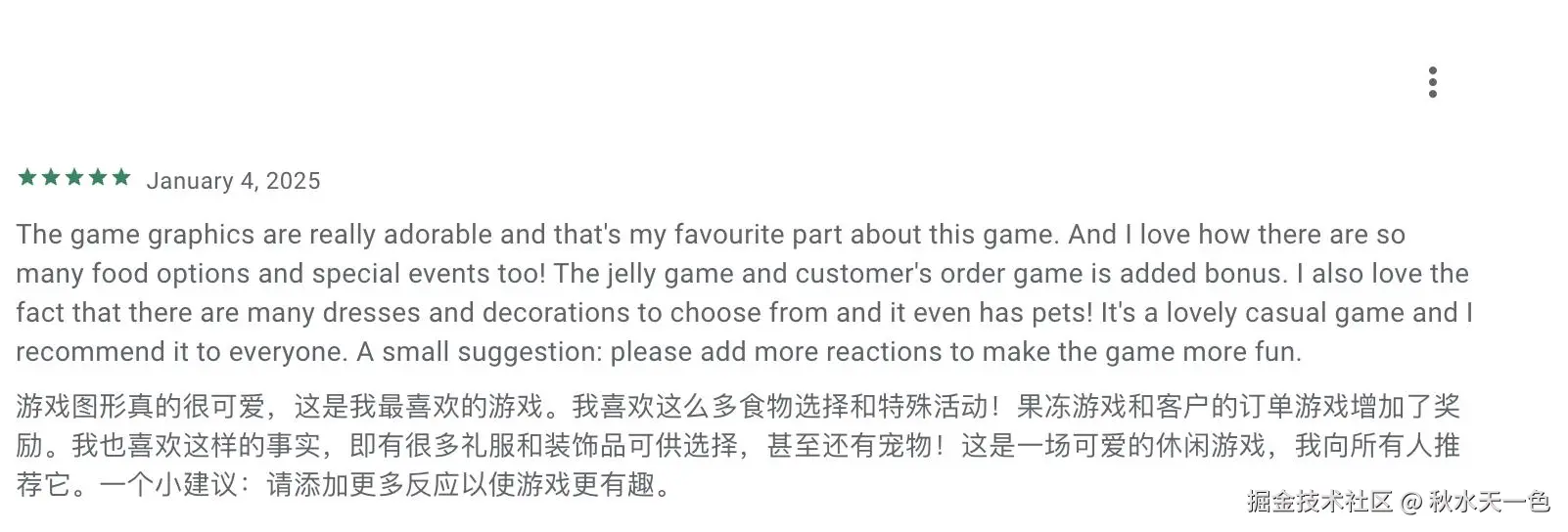 而在商店高星评论中,除了常规夸赞游戏的可爱画风、ASMR音效之外,玩家也反复提到治愈、服装、背景、宠物等装饰搭配元素。