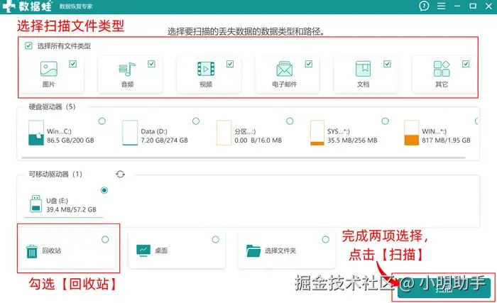 步骤1:在电脑中打开数据 蛙恢复专家,在软件的首页中根据用户自己的实际丢失文件类型选出需要进行扫描恢复的文件类型,再选好【回收站】后点击【扫描】;