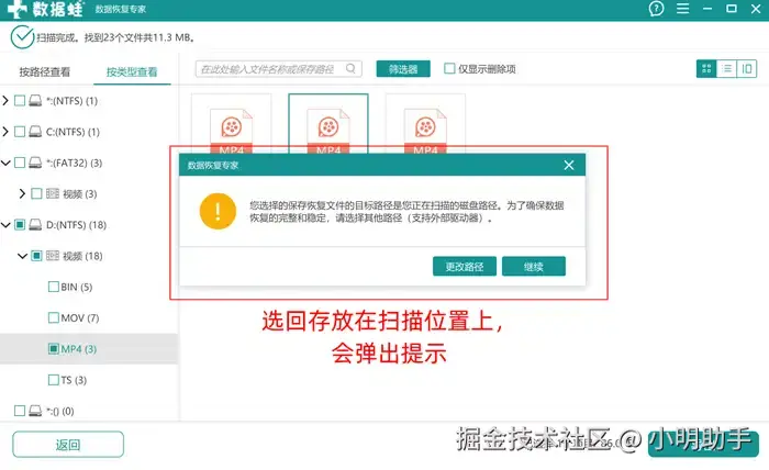 注意:千万不能把恢复文件重新放入旧位置,如果将文件另存位置选择回原位置,会有提示窗弹出。