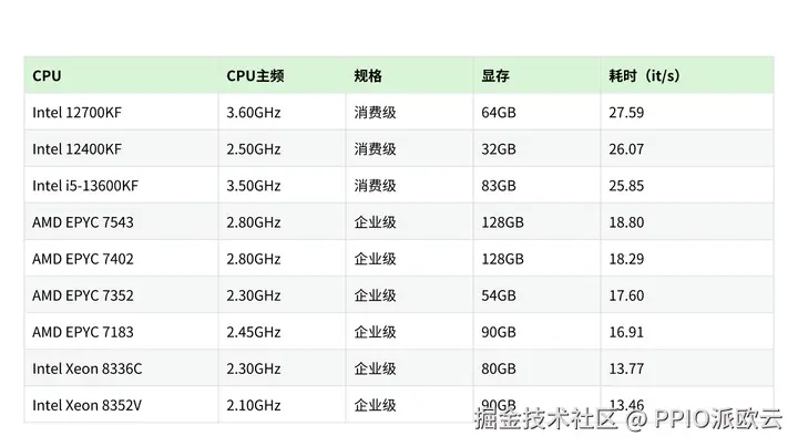 在文生图过程中,CPU为GPU预处理数据。更高的CPU主频可以加速指令集的准备和传输效率,使得GPU无需等待便可保持满载运行。测试显示,相比于低频企业级CPU,高频消费级CPU可将GPU的利用率提升150%以上。
