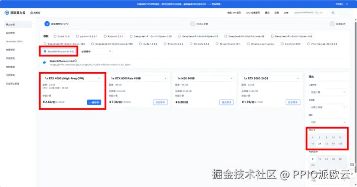 右下角选择【24CPU/卡】,【一键部署】RTX 4090(高频CPU)