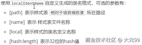 处理css内容时,常通过css-loader,处理CSS的模块化(如import)和使用url引入的外部资源;再通过style-loader,把css-loader解析后的样式内联插入到HTML的head中。配置css-loader的 options: { modules: { localIdentName: xxx } },可以自定义生成类名的样式规则。