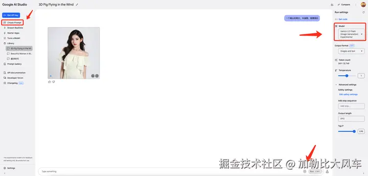 - 在“Model”下拉菜单中,选择“Gemini 2.0 Flash (lmage Generation)Experimental”。