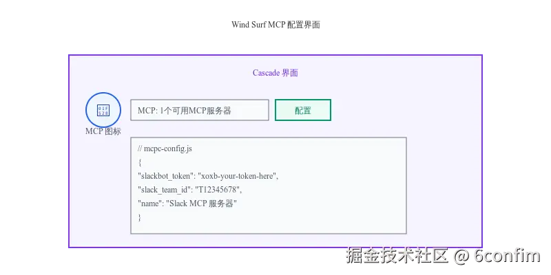 让我们复制这段代码,然后转到Wind Surf。在Wind Surf中,如果你前往Cascade,你会看到一个小锤子图标,上面会显示「MCP:0个可用MCP服务器」。让我们添加一个MCP服务器。