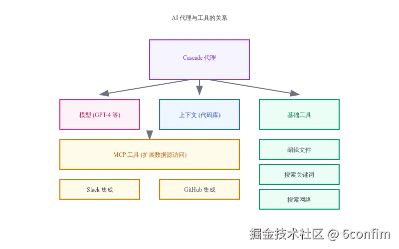 如今,Wind Surf中的Cascade就是一个拥有各种工具访问权限的代理。这些工具包括创建或编辑文件、搜索大量文件中的特定关键词,甚至可以搜索网络和特定的文档站点。