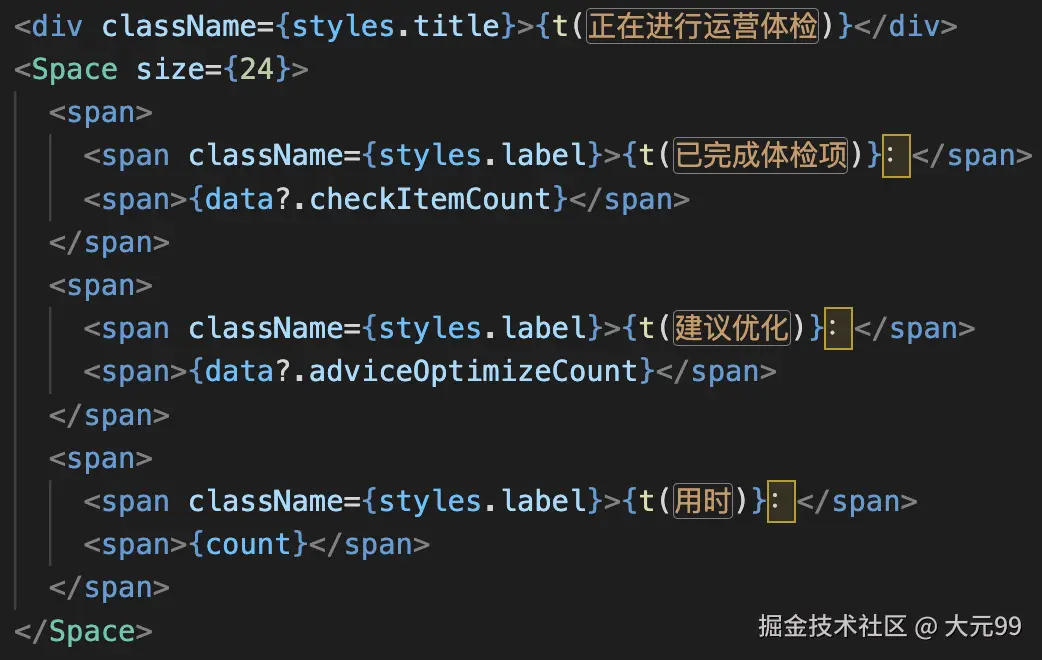 格式化内容时,重点关注 import { useTranslation } from 'react-i18next' 的内容,该hook返回{t: 格式化方法, i18n: 其他国际化相关api对象 }。