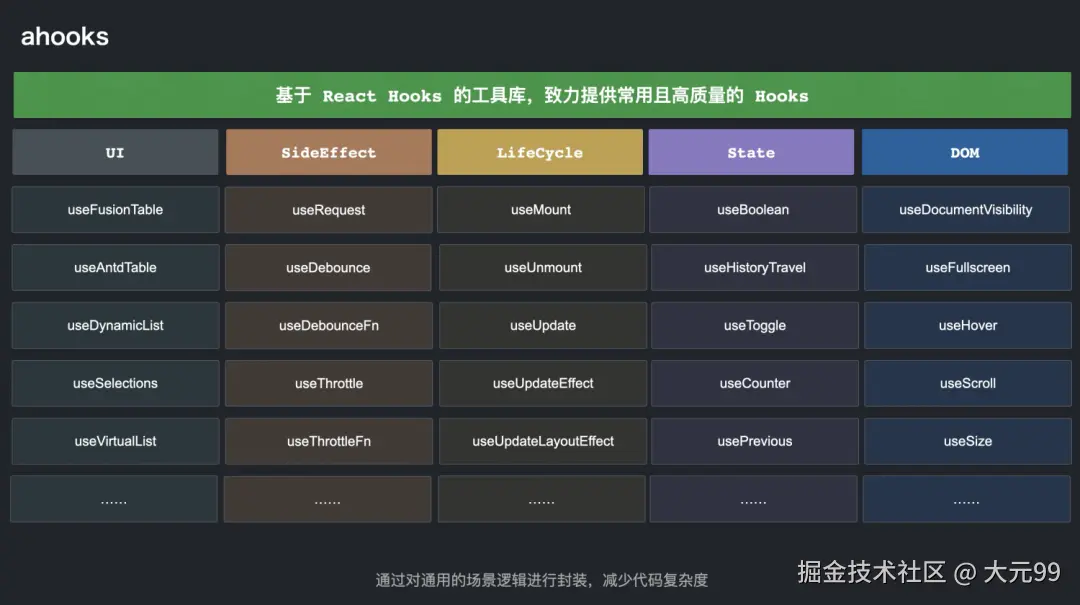 随着 React Hooks 的发展,Hooks 正逐渐成为 React 组件的主流写法。得益于 Hooks 的逻辑封装能力,很多团队都开始建设自己的 Hooks 库,但在建设过程中,会发现各个 Hooks 库提供的 Hooks 大同小异,尤其是基础类 Hooks 几乎都是一样的。