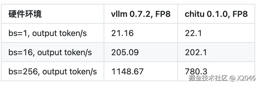 在批量较小的情况下,chitu 性能略强或相当于 vllm,在大批量场景下,chitu 的性能有巨大的下降,大约只有 vllm 的 67.9%。
