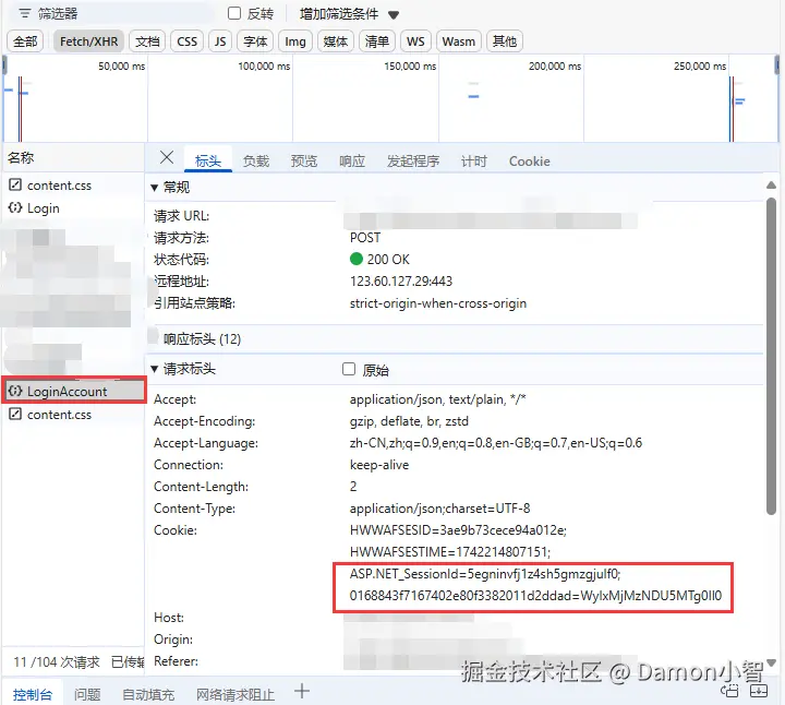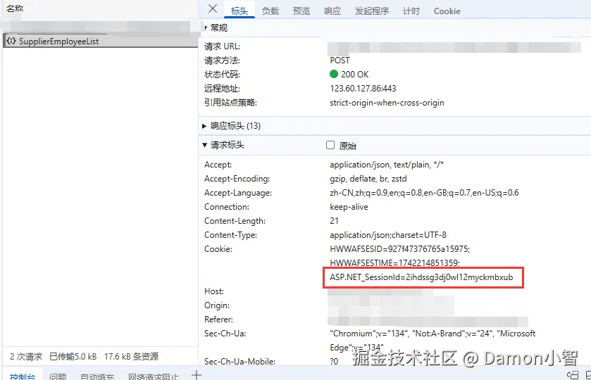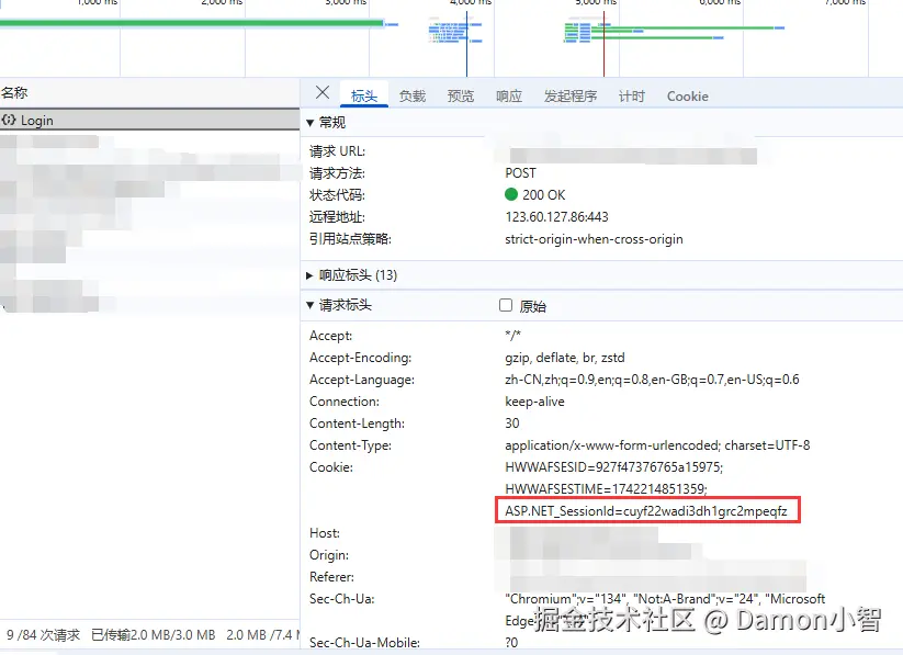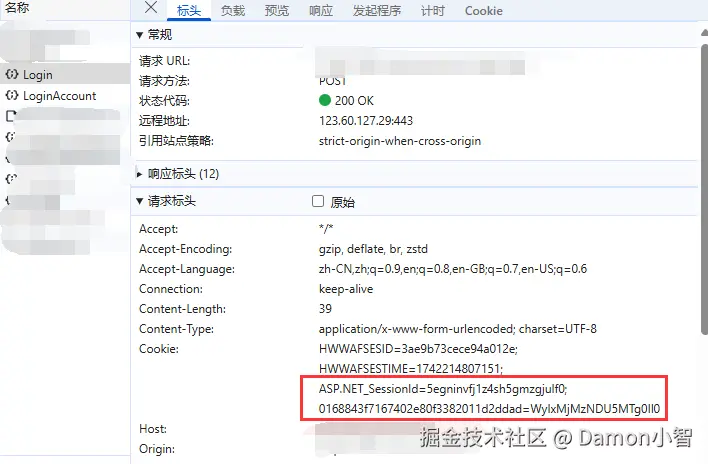 打开浏览器的调试工具,调用登录接口,查看调用此接口时的 Cookie 中的 SessionID。