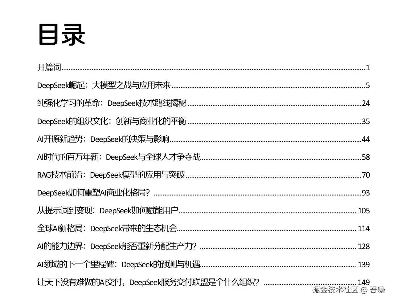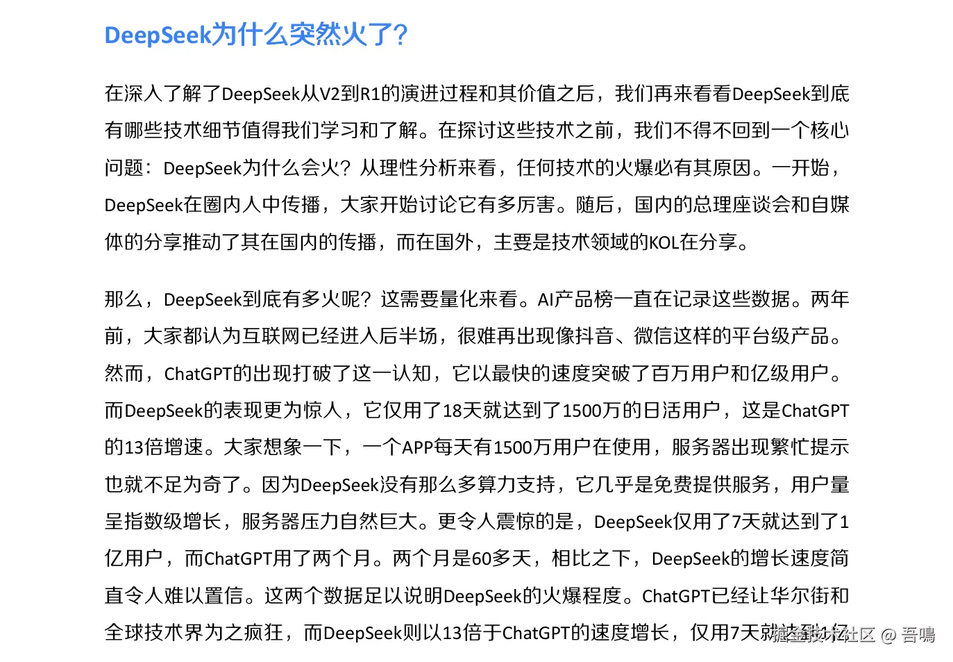 今天吾鳴要给大家分享的是由极客时间出品的DeepSeek报告——《DeepSeek:AI赛道的超级引擎》。报告全面剖析DeepSeek的技术突破、开源战略、商业化路径及全球影响,揭示其作为“AI超级引擎”如何重构行业规则,并为个人、企业及国家提供AI时代的行动蓝图。报告一共160页,文末附上完整版下载地址。