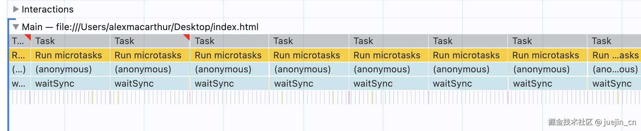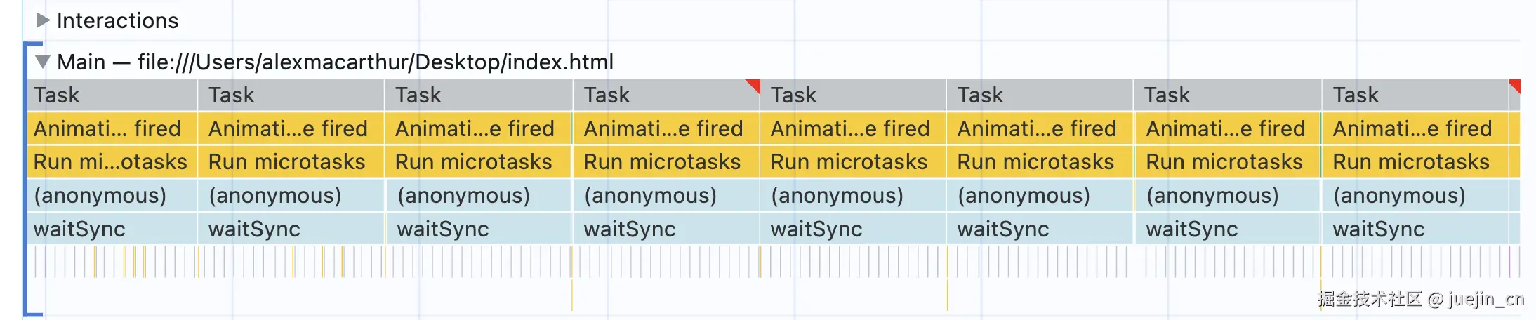 requestAnimationFrame() API 设计用于在浏览器重绘周期安排工作。因此它能精确调度回调,总是在下次重绘前执行。这可能解释了火焰图中任务紧密排列的原因。动画帧回调实际拥有自己的队列,在渲染阶段的特定时间运行,其他任务很难插队。