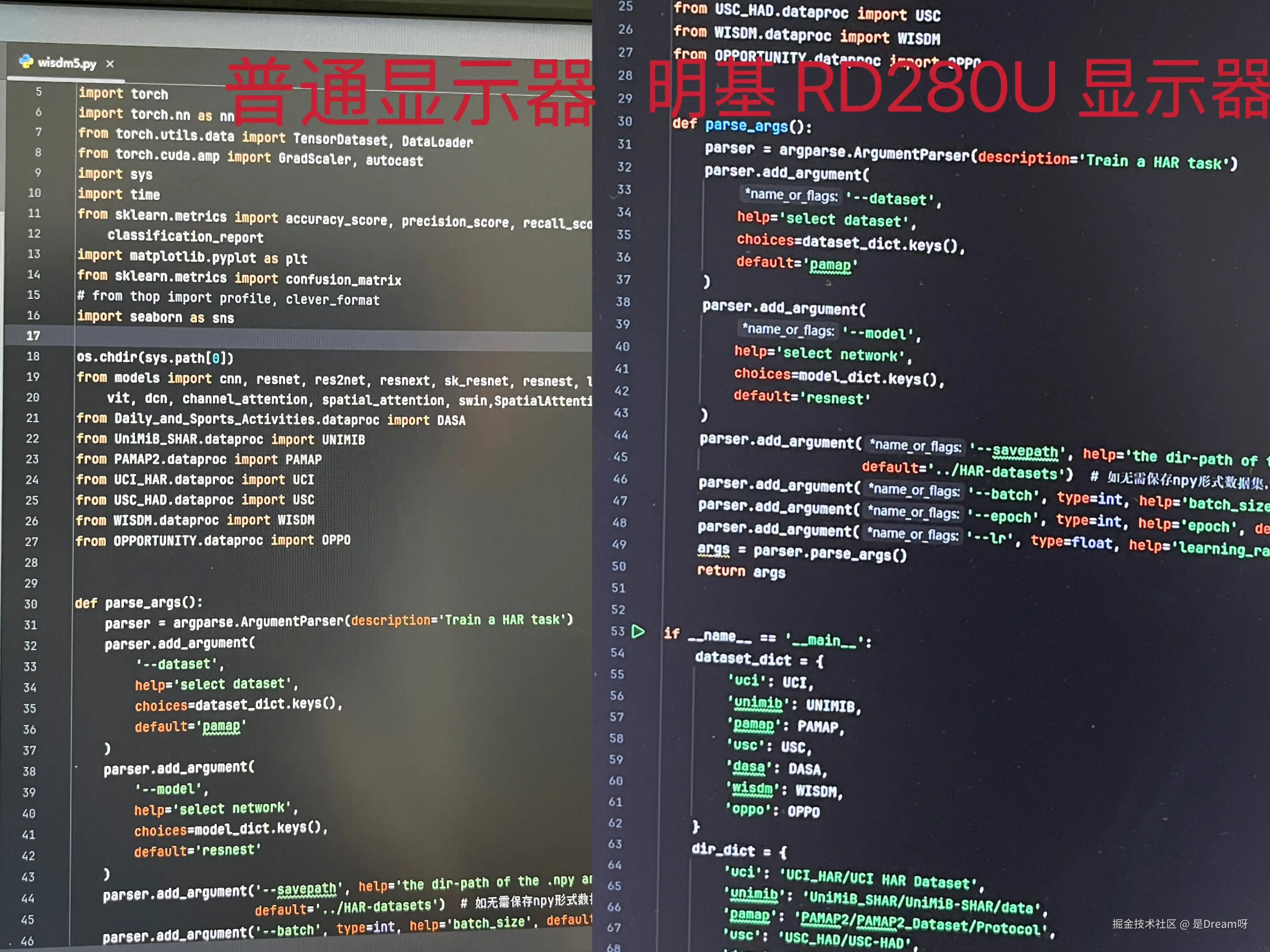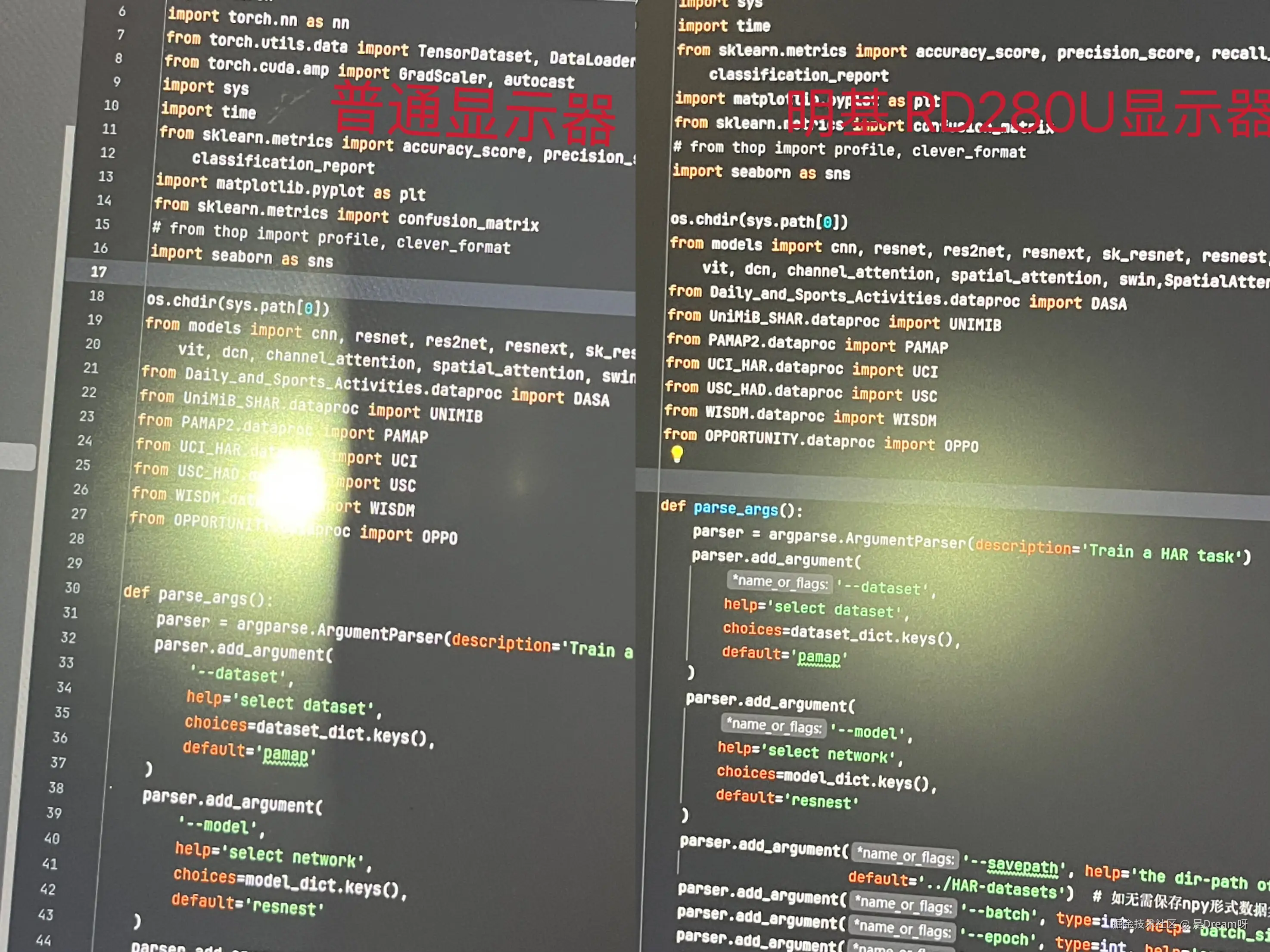 通过实际对比测试可以发现(如图),在相同 IDE 环境下,普通显示器的代码色彩层次较为模糊,尤其是注释与字符串的颜色区分度不足。而 RD280U 的专业模式通过算法级色彩优化,使代码元素的辨识度大大提升。这算法优化过的色彩,看久了眼睛居然比看纸质书还舒服,现在加班到晚上十点,眼睛也不像以前那样又酸又胀。