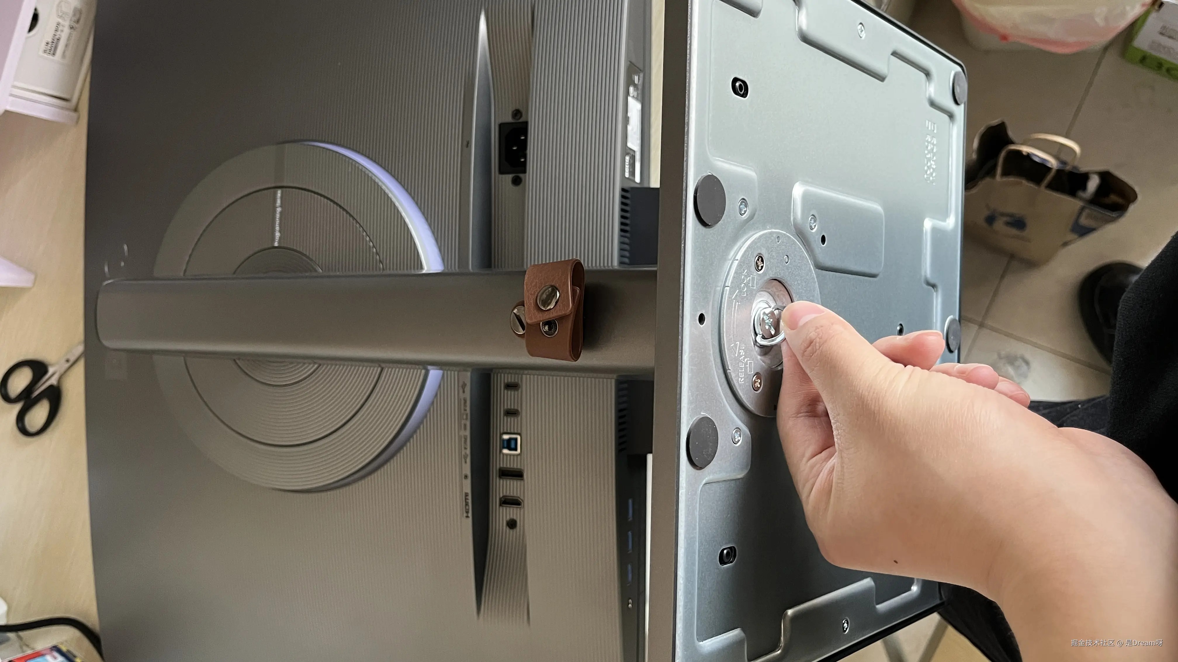让我惊喜的是,安装起来竟然这么简单,仅需要两步,而且全程不需要用到螺丝刀等工具。只需要把显示器后面嵌入到人体工学支架里面,然后再将连接杆和底部连接就可以了,并且底部的螺丝配备了拉环,直接用手便可以轻易扭紧: