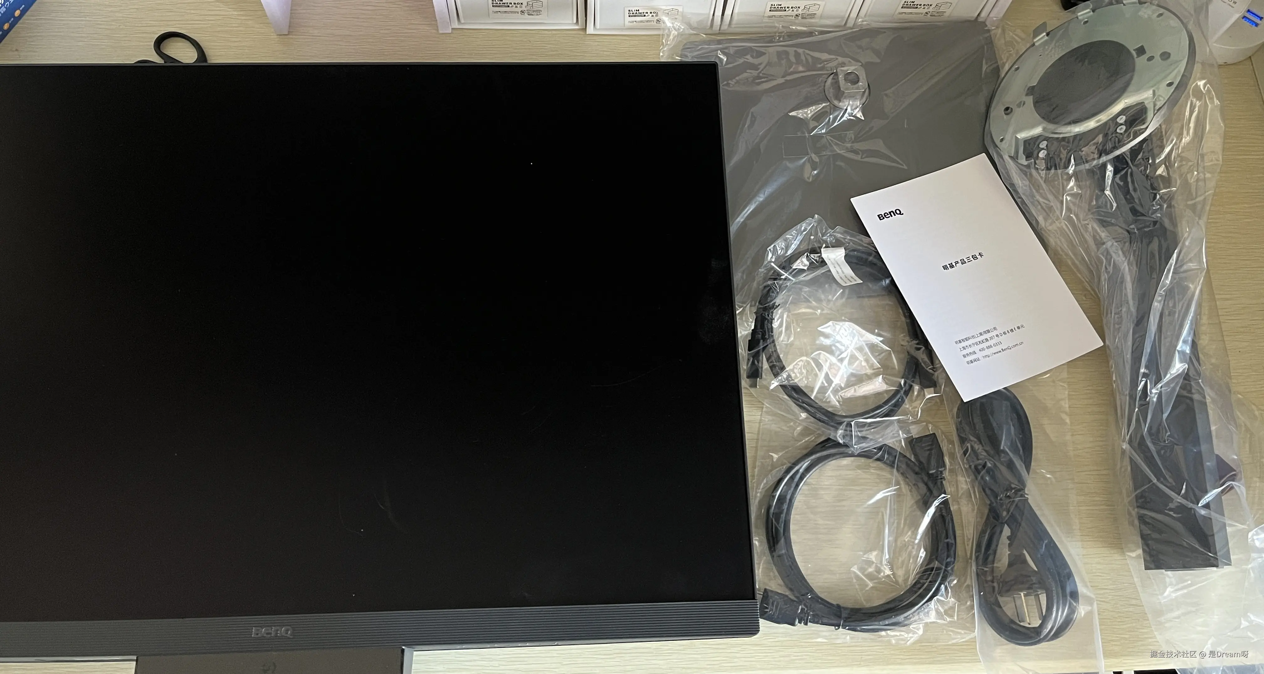 刚拿到明基RD280U这款显示器的时候,属实震惊了我一下,好重啊!要知道我住在五楼,幸亏有电梯,要不凭我的蛮力抬上去真的有点费劲,如果要购买这款显示器的女生,建议找一个像我一样身强力壮的男生帮你搬。我心想这么重的显示器会不会安装起来很困难啊,我这种懒人对安装东西真的很烦恼,买东西都是能简单一点就简单一点。打开包装发现一共有两层,包括有显示器主体,一个底座、一个可调节人体工学支架以及连接线材——电源线、USB-C线和 HDMI 线: