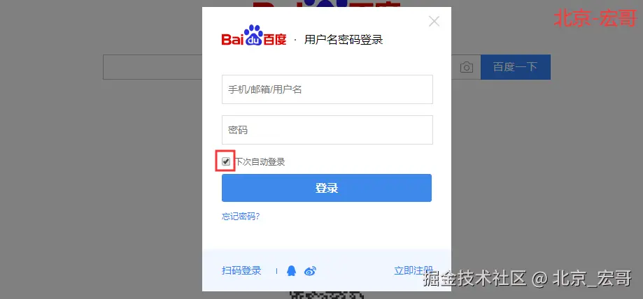 还是以百度首页点击登录后,进入登录界面的“下次自动登录”举例: