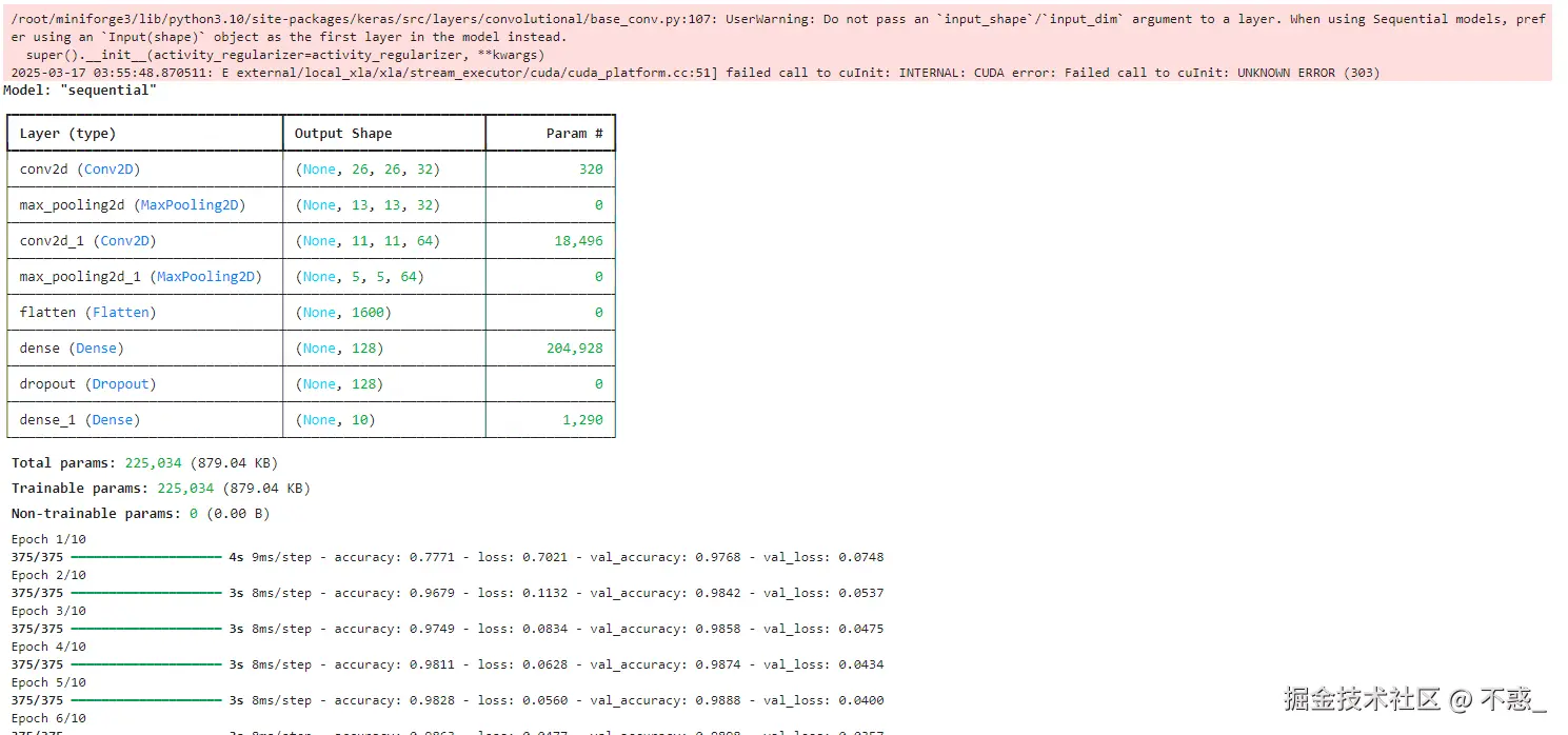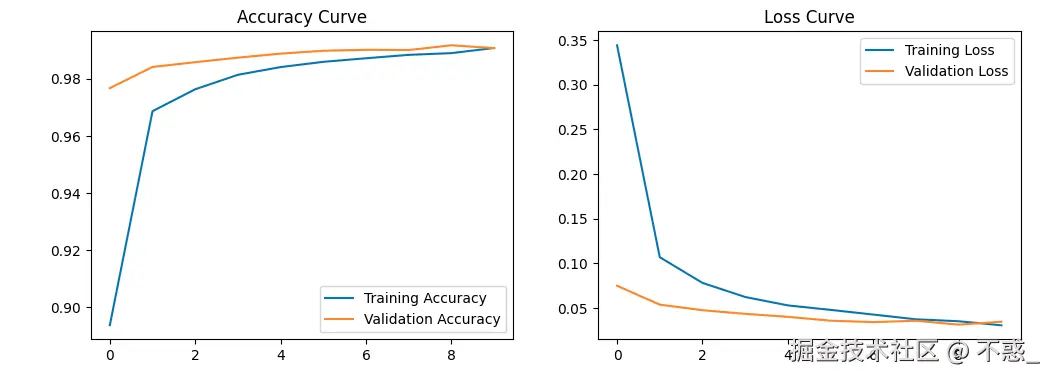超参数设置: 在model.compile()中设定的Adam优化器,集动量法与自适应学习率于一身,相比传统SGD更能适应复杂地形。batch_size=128的设定既考虑内存效率,又保证梯度估计的稳定性。10个epoch的训练周期设计,则是在欠拟合与过拟合的钢丝上寻找平衡点。