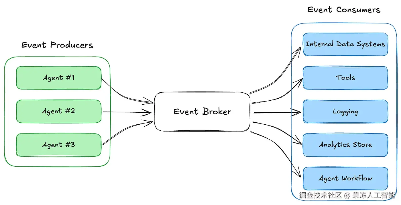 EDA 通过充当数据的“中央神经系统”来解决这一挑战。它允许代理以异步方式广播事件,确保信息可以动态流动,而不会形成刚性依赖。这样,代理既能自主运作,又能无缝集成到更广泛的工作流和系统中。