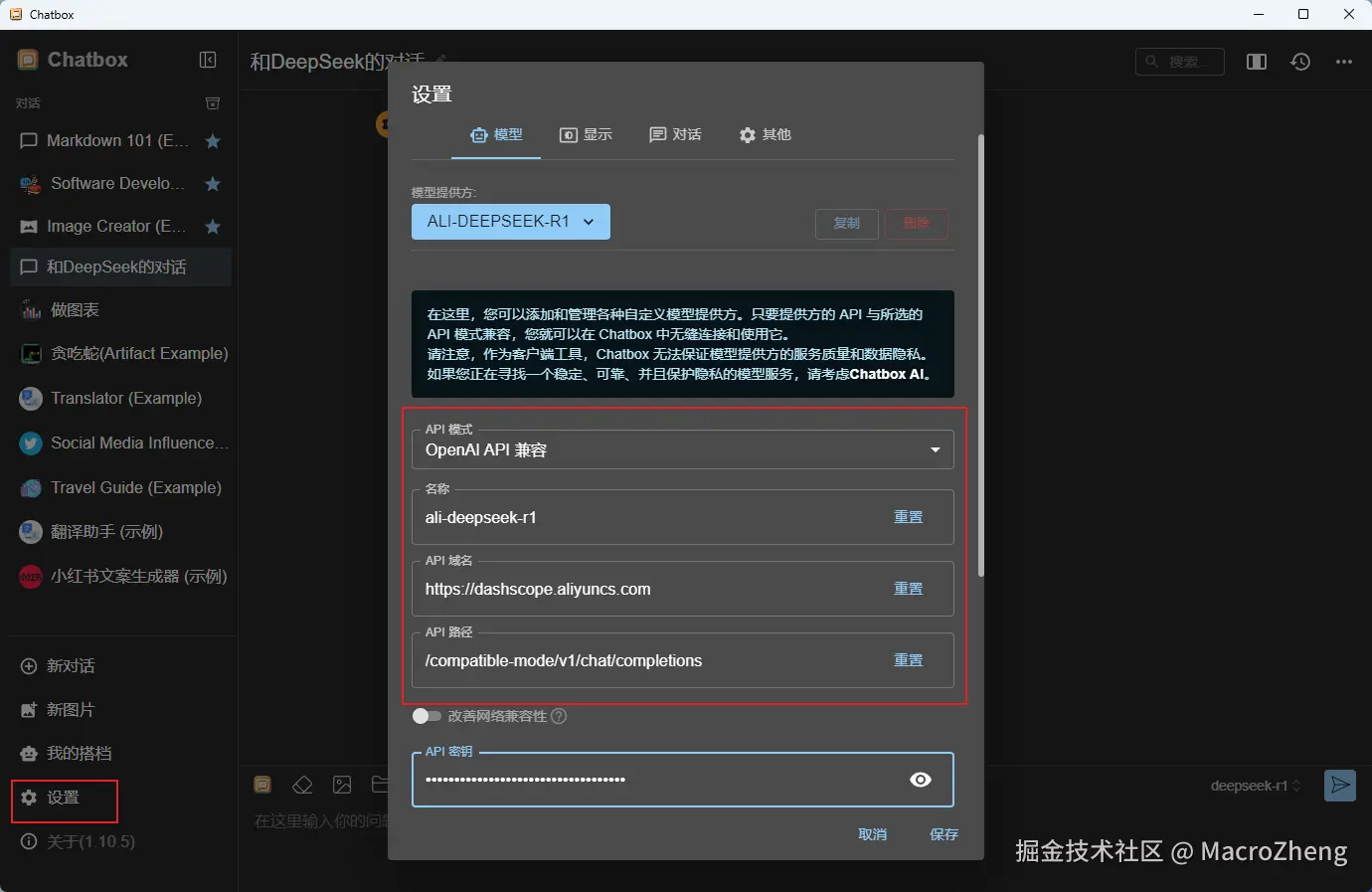 设置中进行模型的设置,这里我使用的阿里云百炼中的DeepSeek模型,如图设置即可;