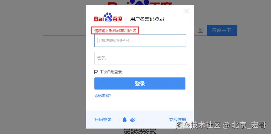 本来想还是继续采用for语句来把所有的复选框勾选一遍,例如这样的场景:注册一个网站勾选身份或者职业的时候,由于没有找到合适的demo网站。这里还是以百度举例,登录时,勾选下次自动登录: